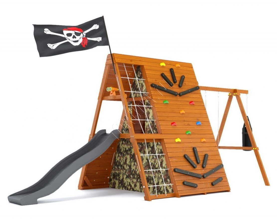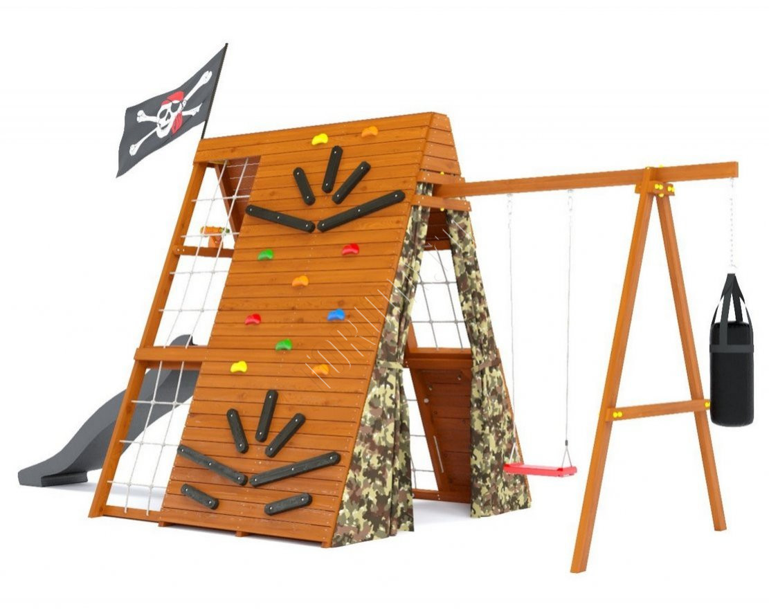 - Многосекционный скалодром, дизайнерский скалодром и разновозрастная гладиаторская сетка дадут детям возможность попрактиковаться в лазании и укрепить свои мышцы. Боксерская груша в свою очередь поможет детям убрать энергию. В игровом комплексе также есть горка высотой 2,2 метра с платформой для спуска, качельный блок с качелями лодочка и внутренний лаз с выходом на платформу.