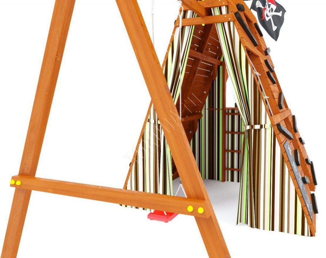 - Занавесы с подхватами способствуют созданию мелодраматических сцен, а наличие меловой доски размером 810х390 мм позволит детям рассказывать свои истории и рисовать картинки. Внутренняя лестница и большой пиратский флаг с флагштоком создадут атмосферу пиратства и игр в прятки.