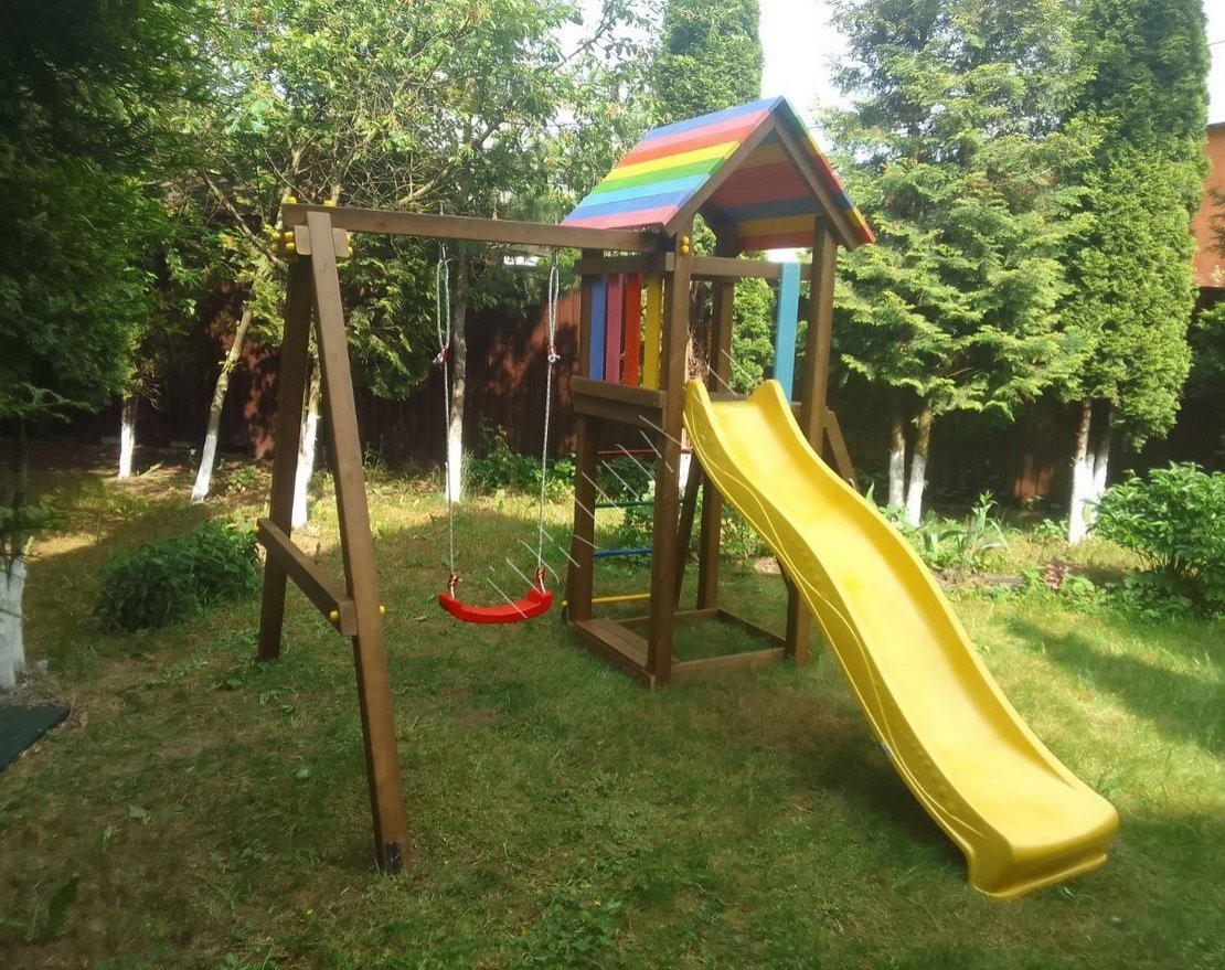 - Домик закрыт сверху деревянным перекрытием – оно скрывает от прямых солнечных лучей и позволяет передохнуть на свежем воздухе. Комплекс универсален, поскольку включает в себя столь любимые детьми горку и качели.