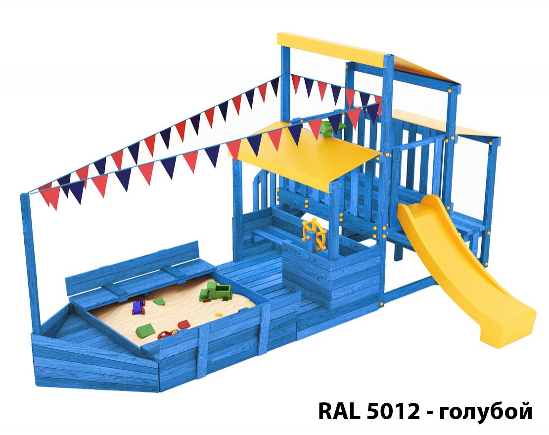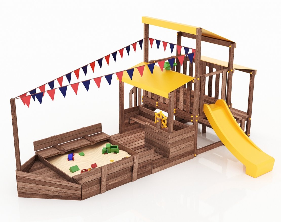 Детская песочница с крышкой-лавочкой и кораблик, включающий в себя штурманскую рубку и капитанский мостик с горкой с высоты 900 мм с флажками.