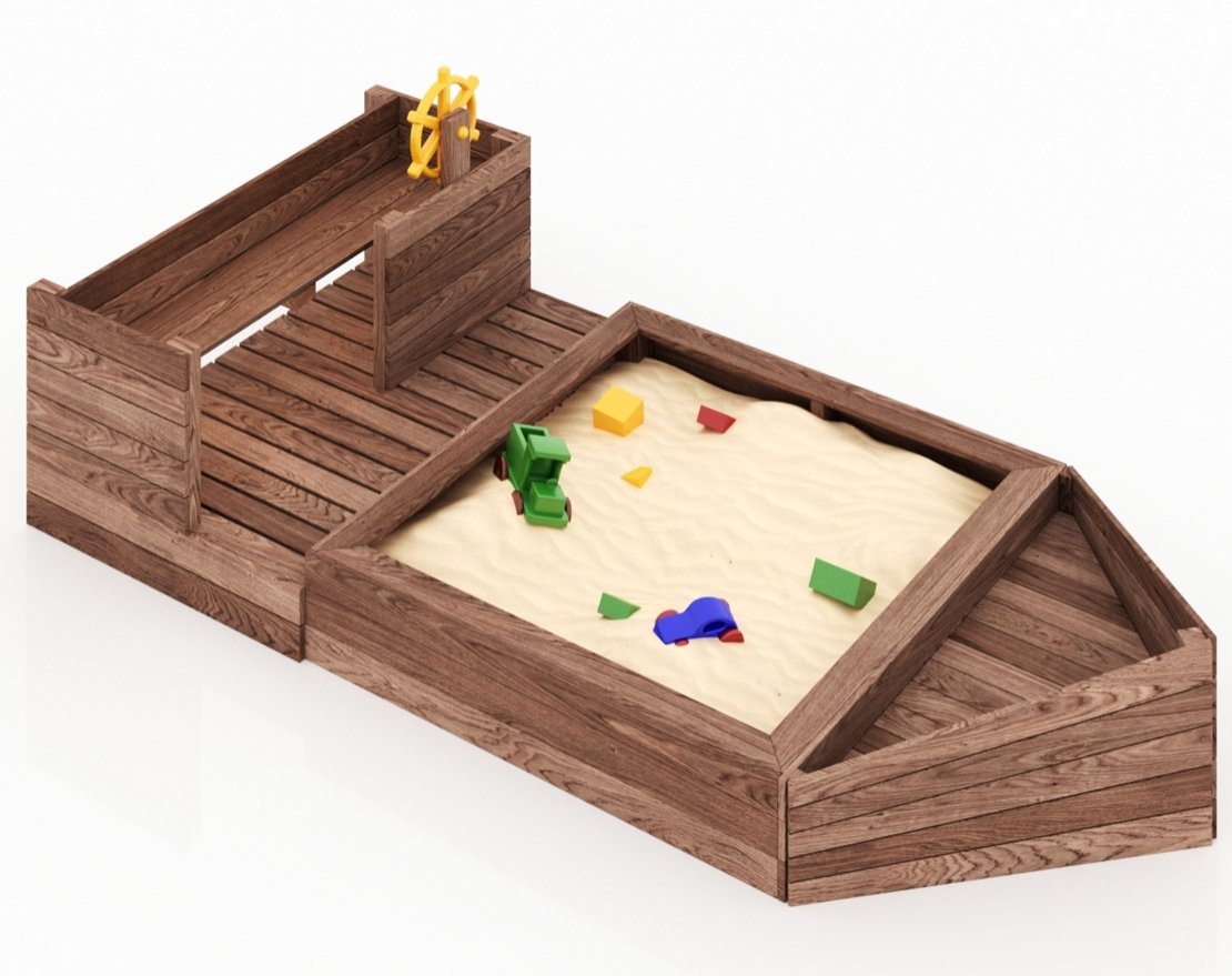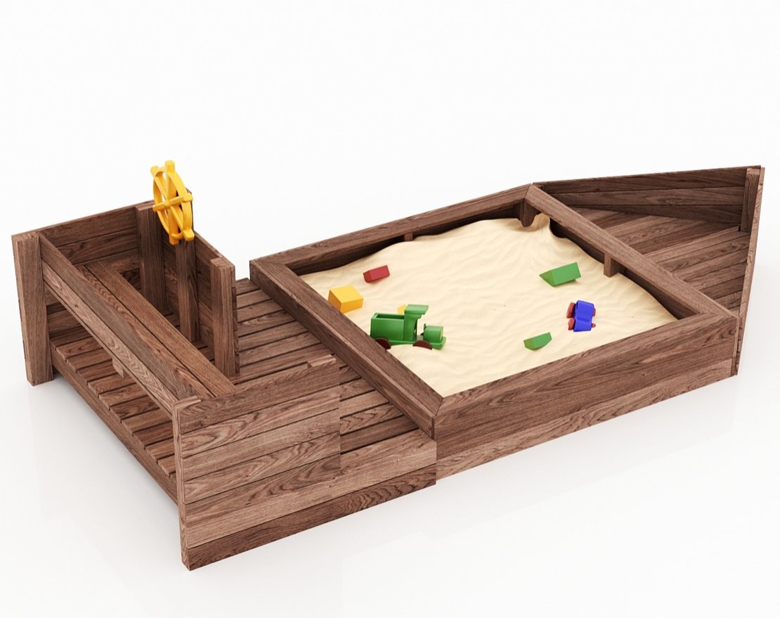 Детская песочница-кораблик и штурманская рубка со штурвалом.
