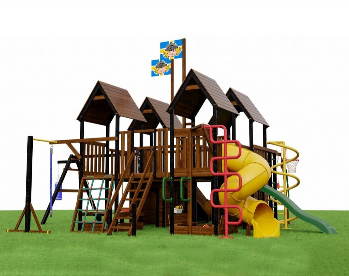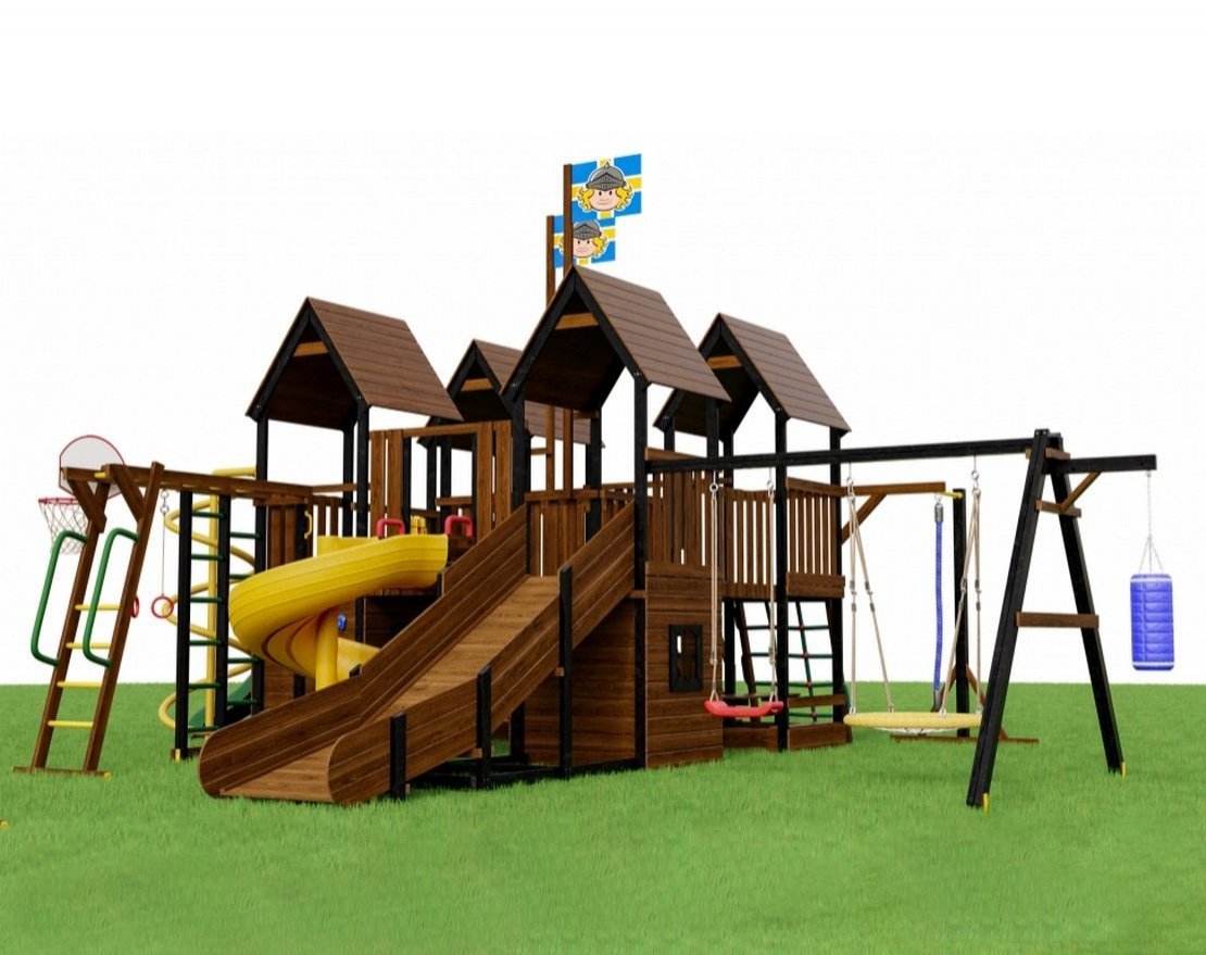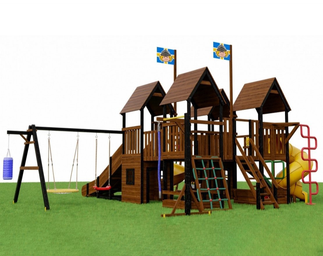 - 4 игровые башни с деревянной крышей (2 с домиком, 2 с песочницей)