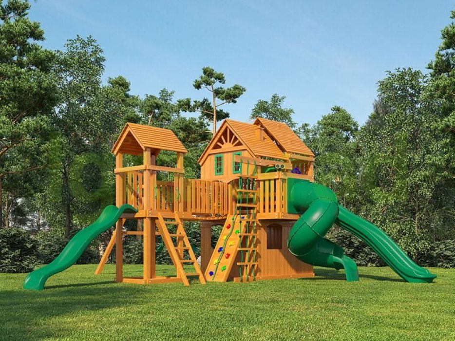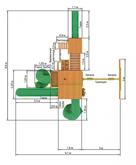 Родители могут быть спокойны за своих малышей, ведь комплекс обладает высокой степенью безопасности с усиленными комплектующими. Деревянные элементы обработаны антисептиком, препятствующим порче материала, так что эта красивая площадка будет радовать ваших детей очень долго.